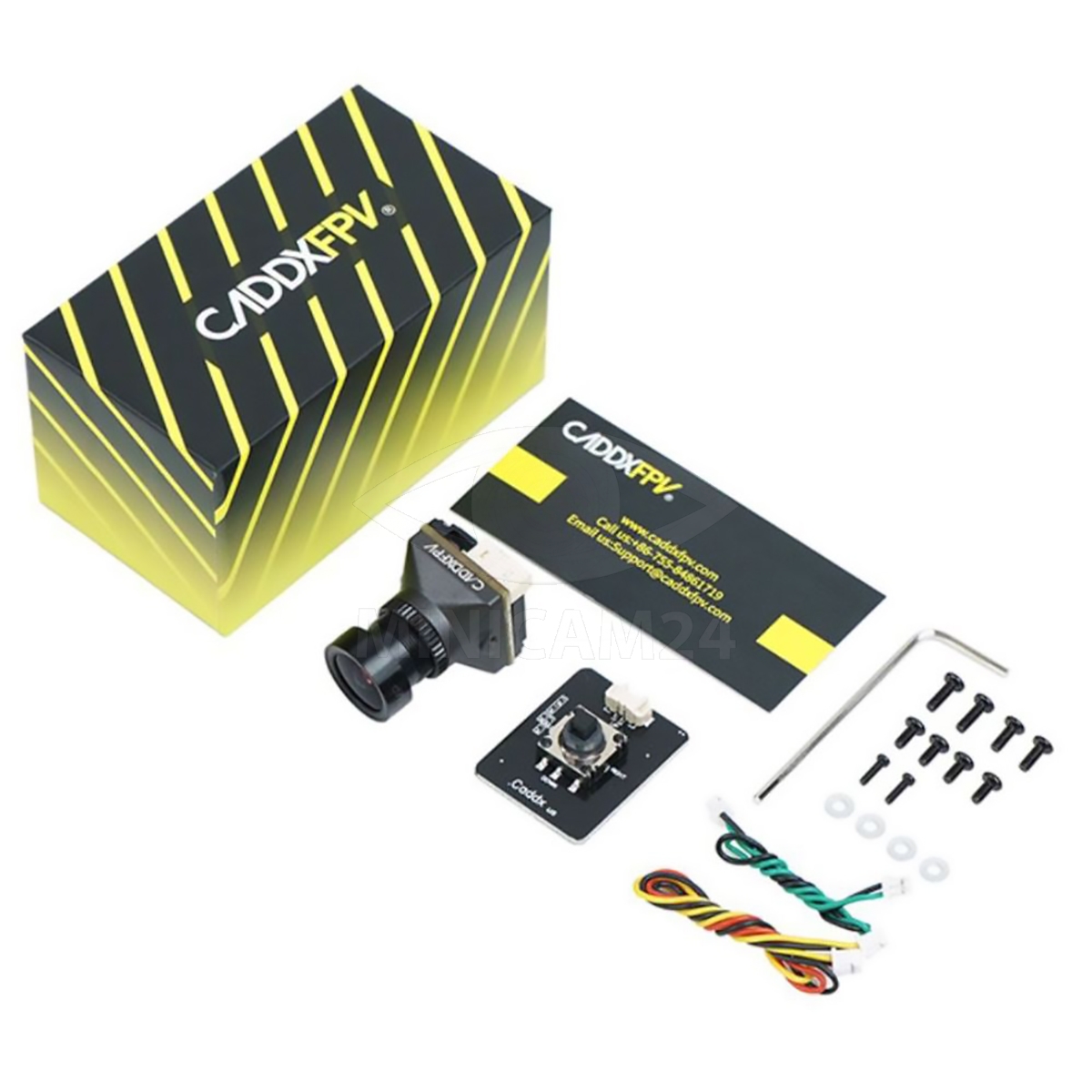 Комплектация камеры включает FPV камеру CADDXFPV Ratel Pro 1500TVL, OSD пульт, 2-контактный и 3-контактный силиконовые кабели, шестигранный ключ и набор винтов. С компактными размерами 19 × 19 мм и весом всего 9,5 г, эта камера легко интегрируется в любые FPV-системы.